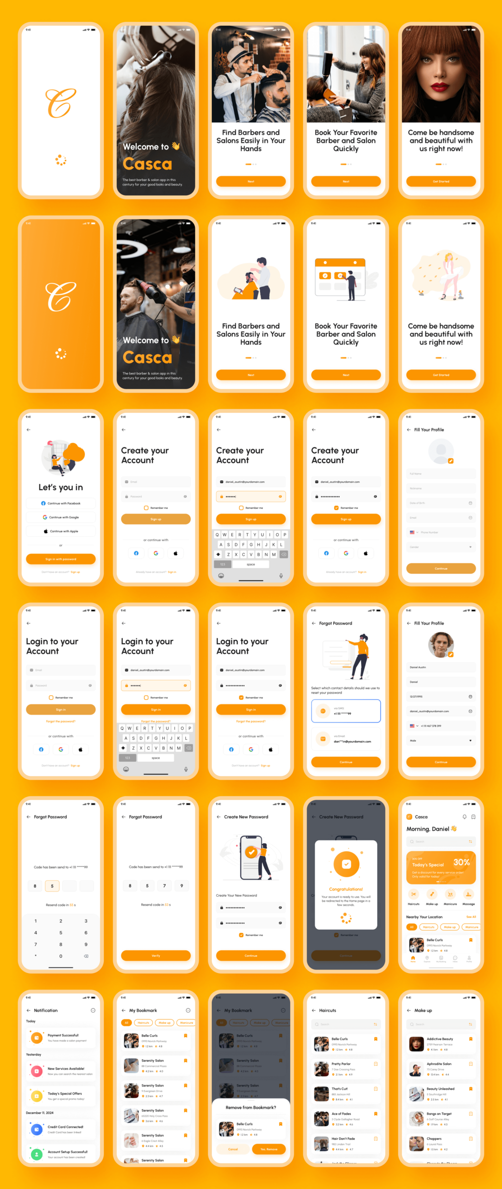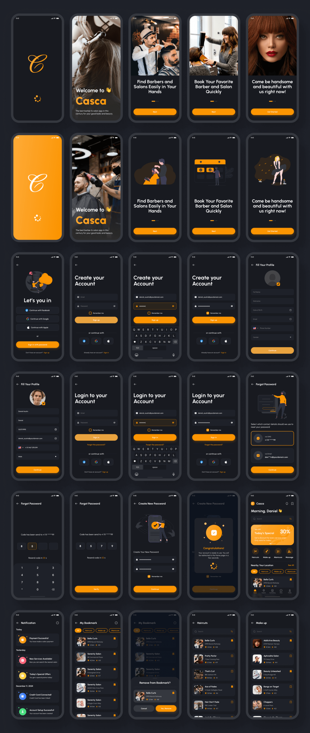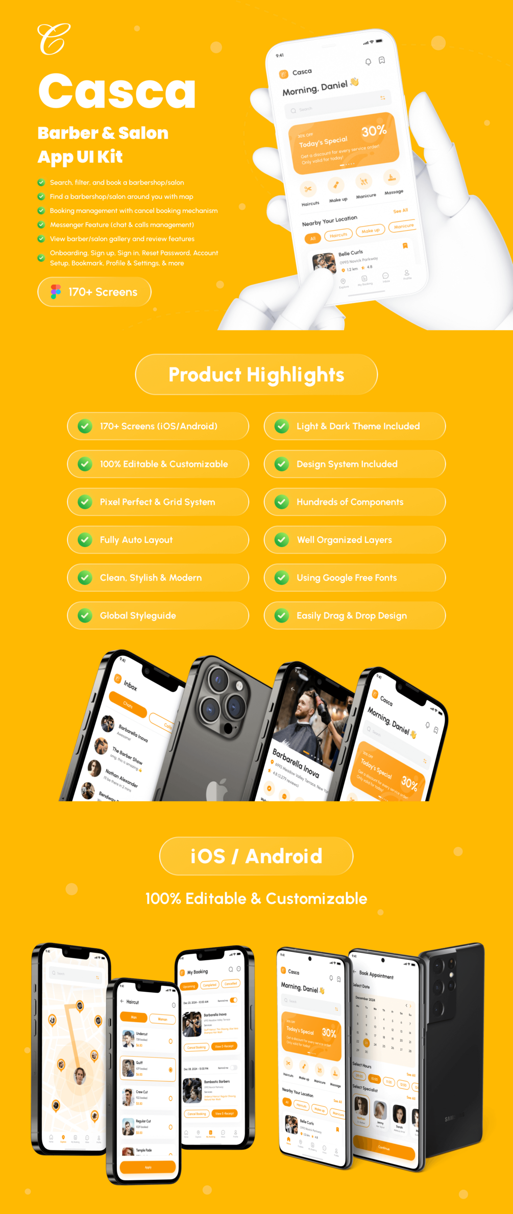 Casca - Barber & Salon App UI Kit support for iOS/Android (design system included) and 170+ screens which is 100% editable & customizable. Designs are available in Figma. In addition, the design is also equipped with a version of Light & Dark Theme.