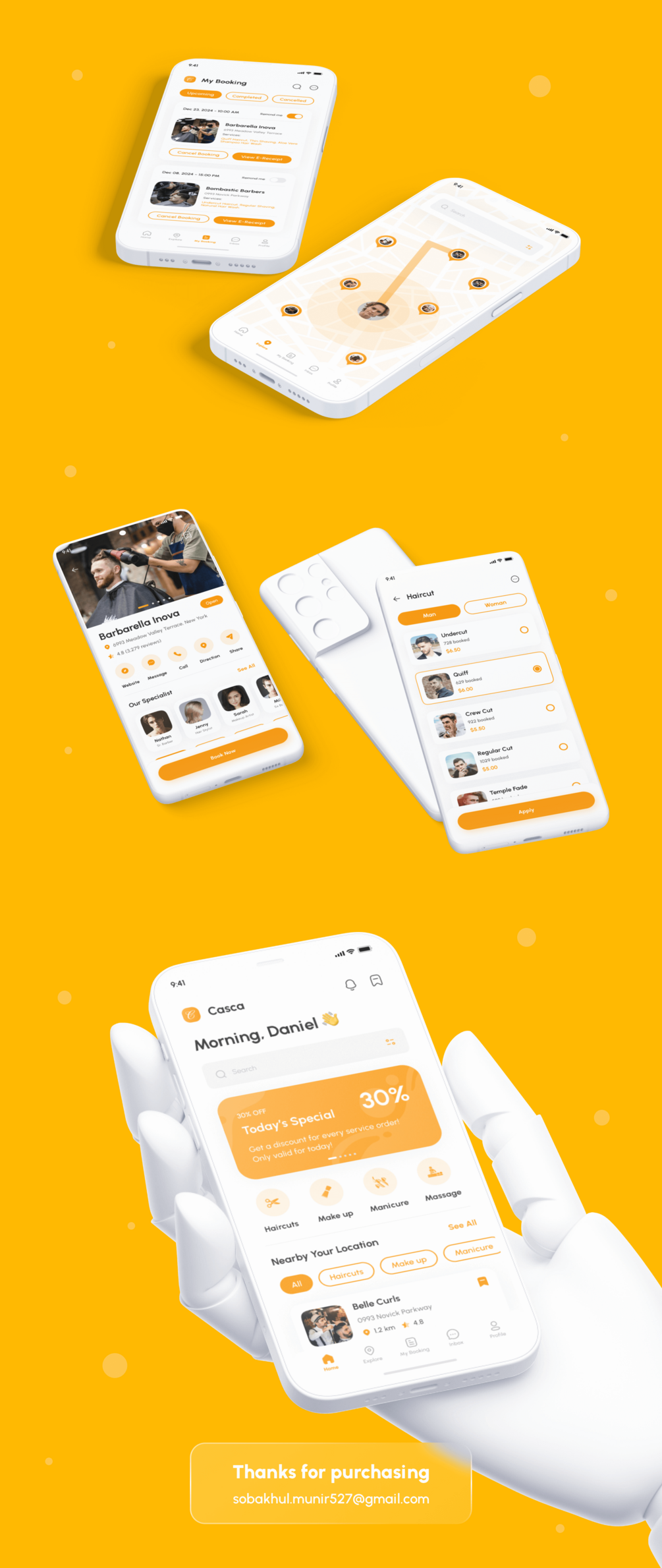You'll get Casca - Barber & Salon App UI Kit Figma with 174 screens + design system included. You will get it immediately after making a purchase. A download link will appear and you can download 100% editable UI Kit files without waiting time 🔥