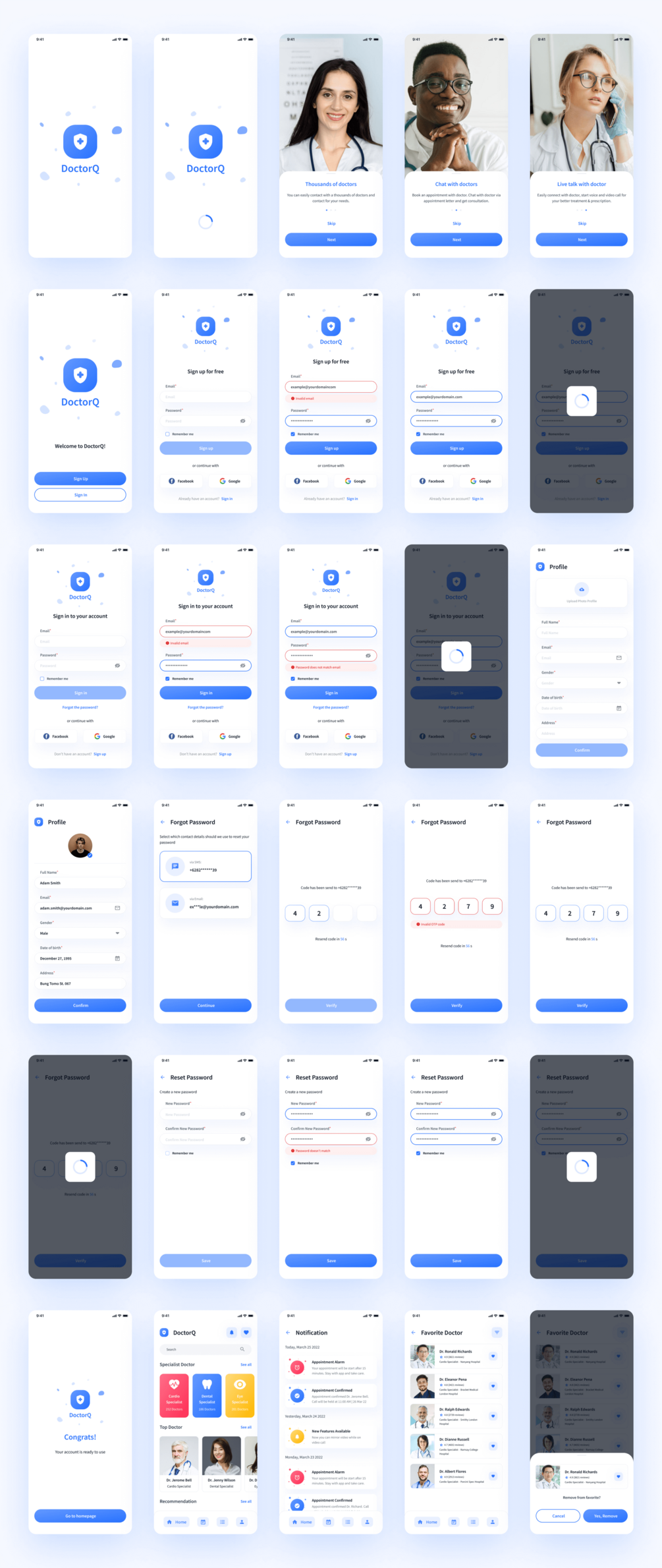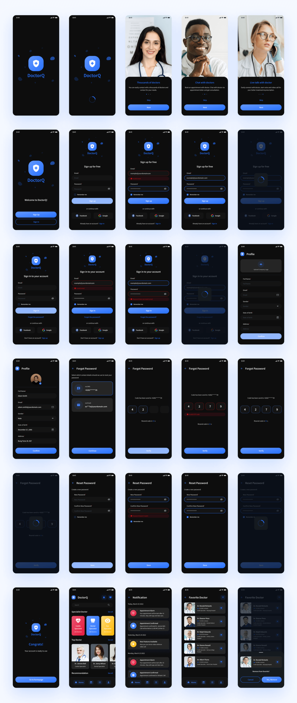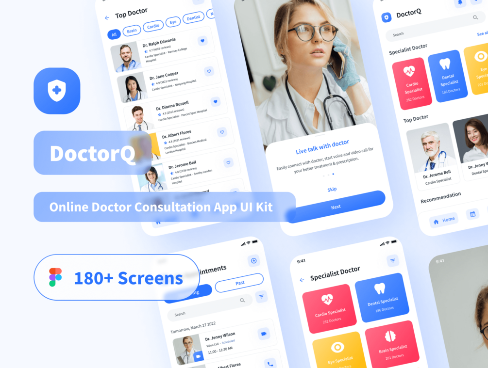 DoctorQ is a Premium and High-Quality Online Doctor Consultation Mobile App UI Kit with 182 Screens which is highly customizable. Designs are available in Figma. In addition, the design is also equipped with a version of Light & Dark Mode.