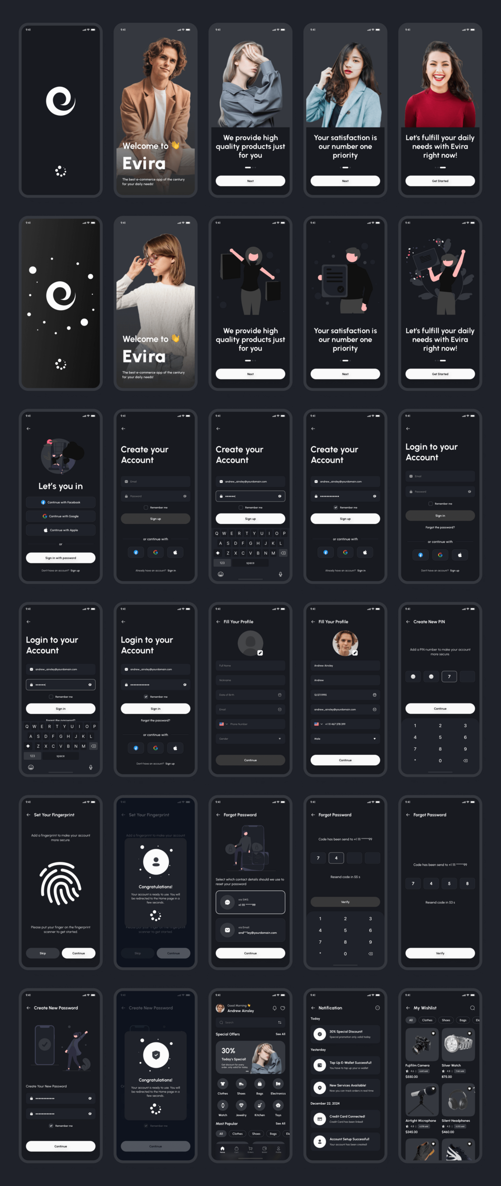 Evira support for iOS/Android (design system included) and 192 screens which is 100% editable & customizable. Designs are available in Figma. In addition, the design is also equipped with a version of Light & Dark Theme.