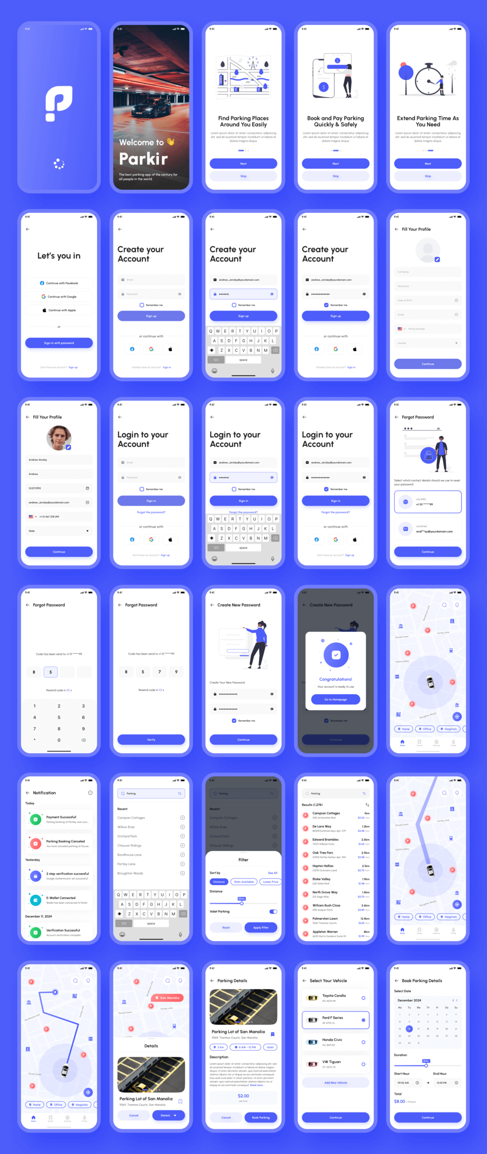 Parkir - Parking App UI Kit is equipped with iOS/Android support (design system included) and 116 screens which is 100% editable & customizable. Designs are available in Figma. In addition, the design is also equipped with a version of Light & Dark Theme.