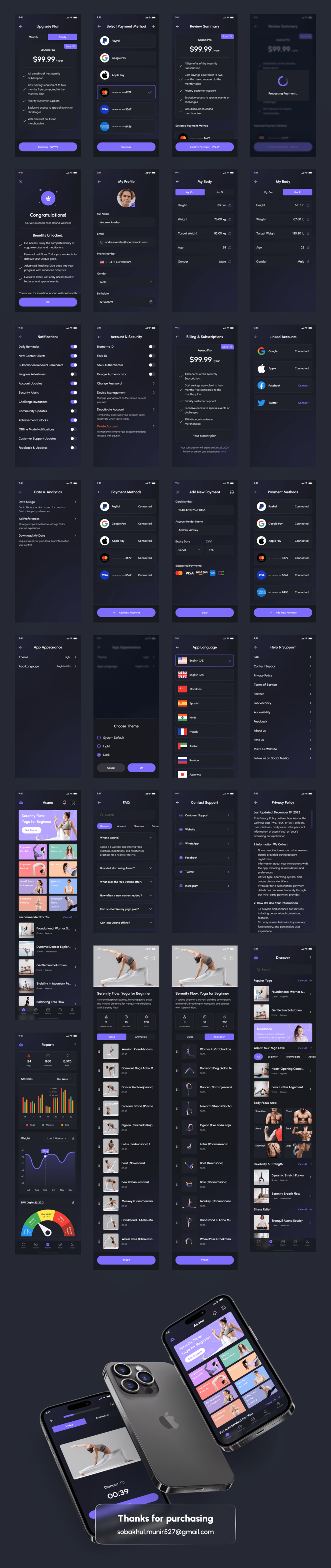 You'll get Asana - Fitness & Yoga App UI Kit Figma with 210 screens + design system included. You will get it immediately after making a purchase. A download link will appear and you can download RAW files of 100% editable UI Kit without waiting time. If Gumroad doesn't support payments in your country, then just contact me via email for alternative payment methods ๐ฅ