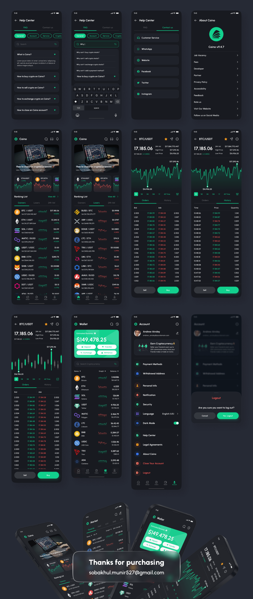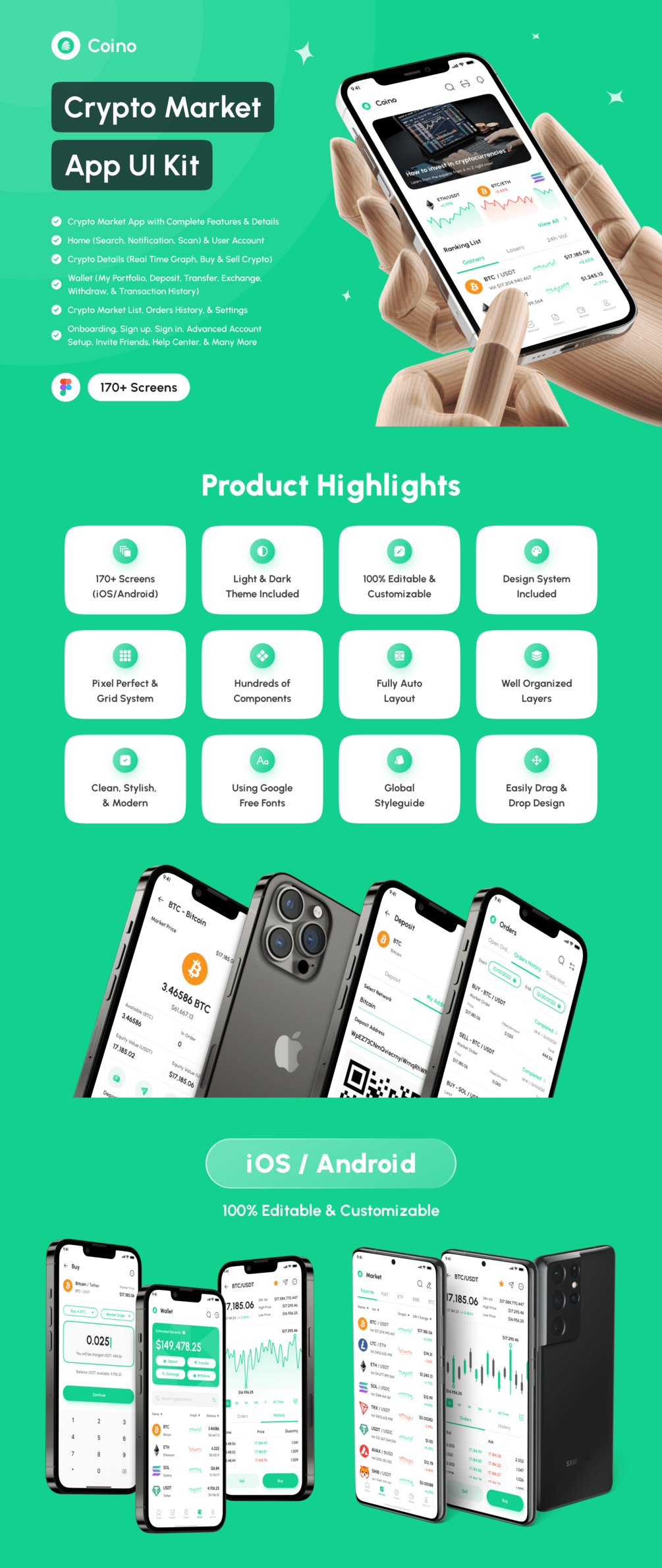 Coino support for iOS/Android (design system included) and 176 screens which is 100% editable & customizable. Designs are available in Figma. In addition, the design is also equipped with a version of Light & Dark Theme.