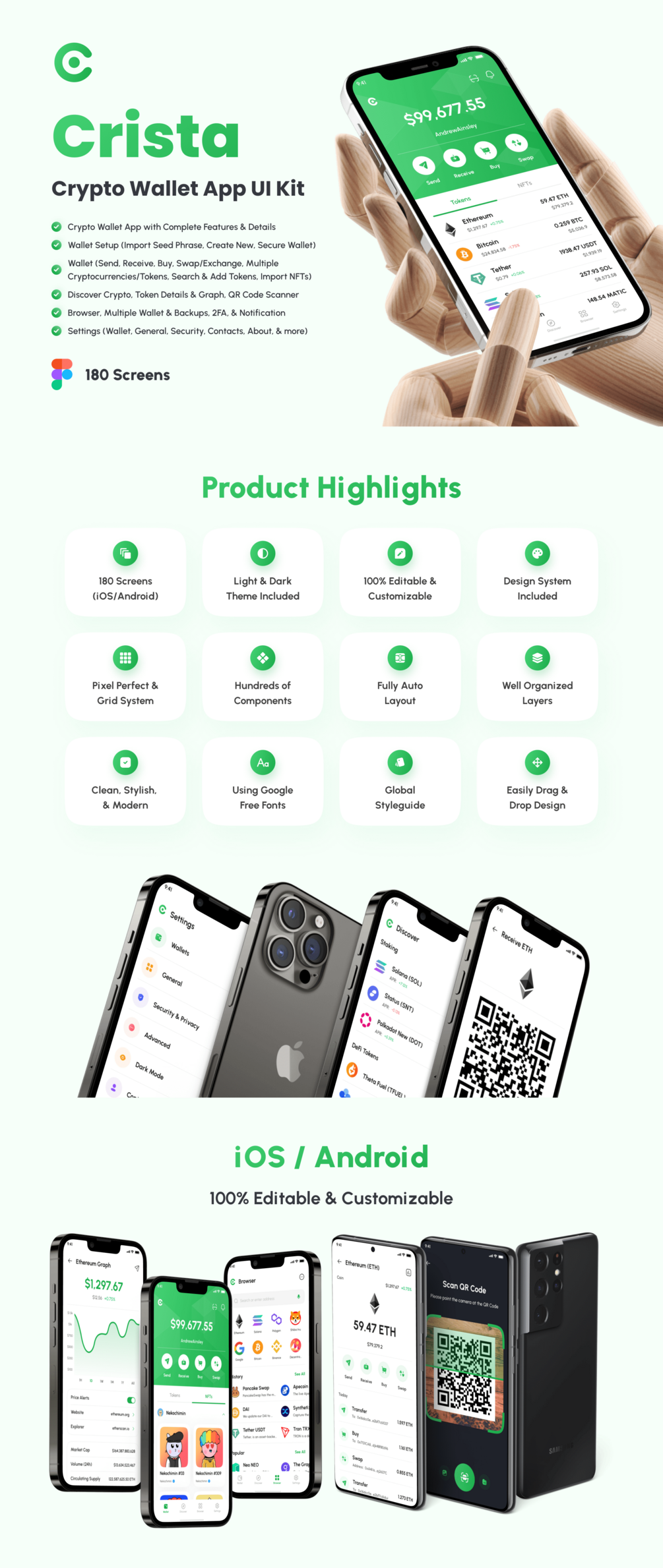 Crista support for iOS/Android (design system included) and 180 screens which is 100% editable & customizable. Designs are available in Figma. In addition, the design is also equipped with a version of Light & Dark Theme.