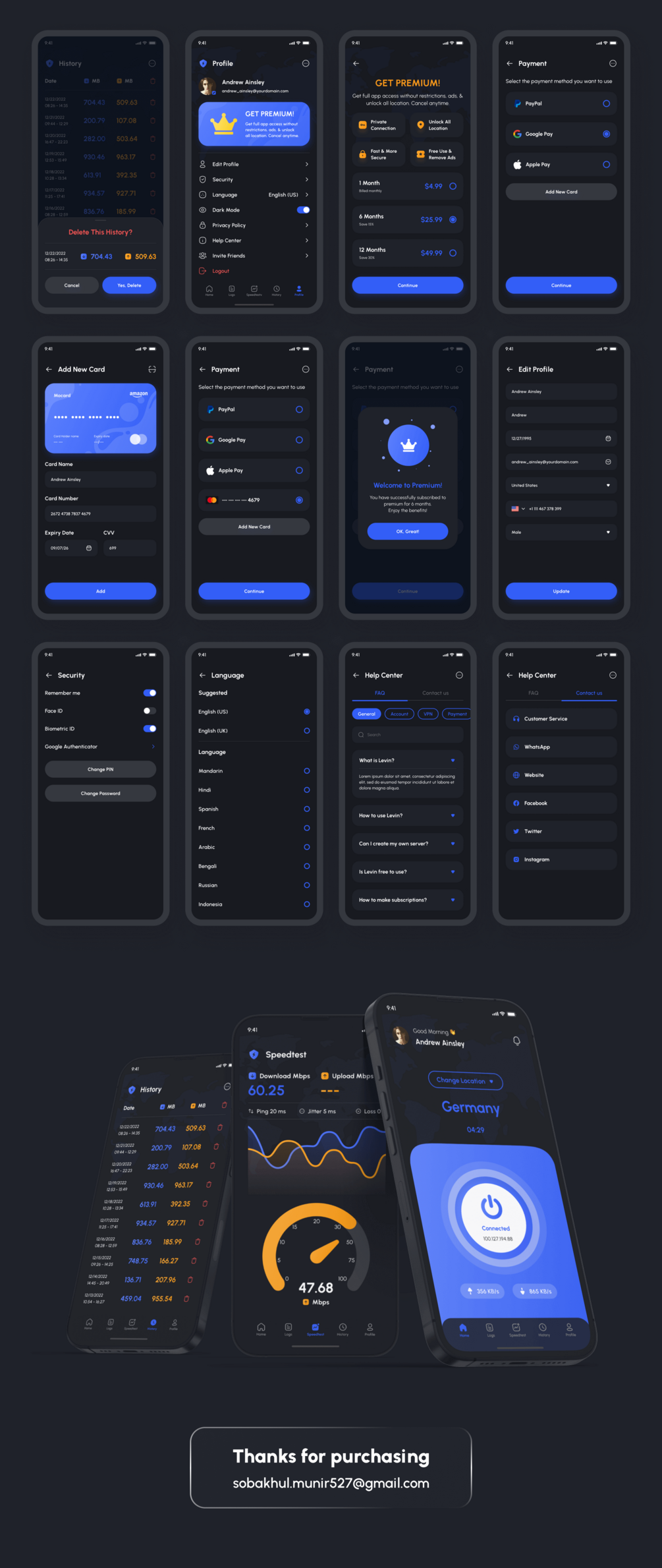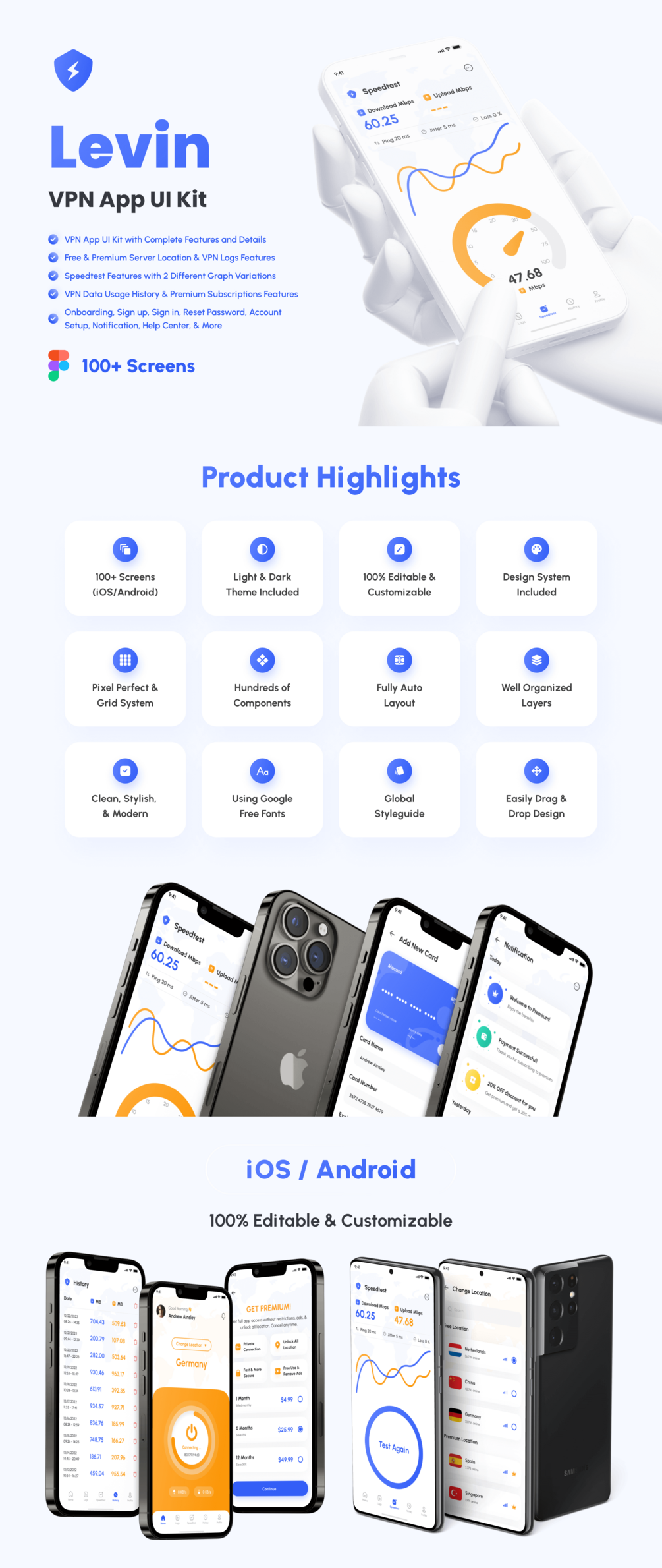 You'll get Levin - VPN App UI Kit Figma with 106 screens + design system included. You will get it immediately after making a purchase. A download link will appear and you can download 100% editable UI Kit files without waiting time 🔥