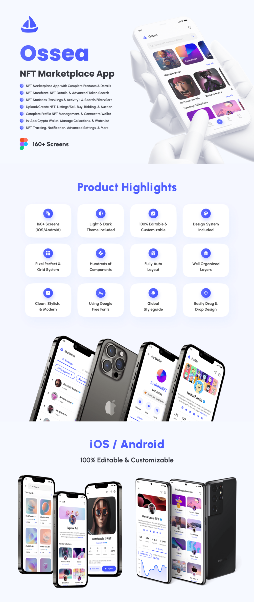 Ossea support for iOS/Android (design system included) and 162 screens which is 100% editable & customizable. Designs are available in Figma. In addition, the design is also equipped with a version of Light & Dark Theme.