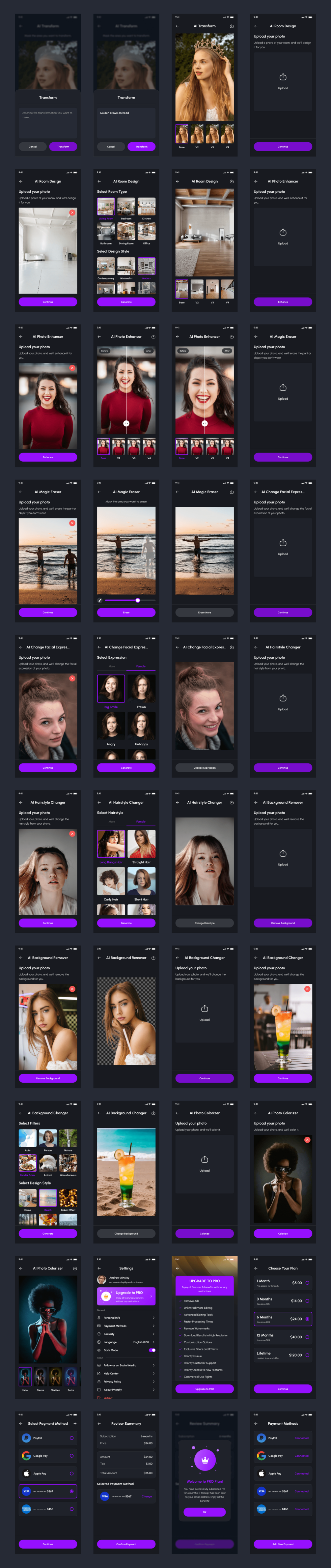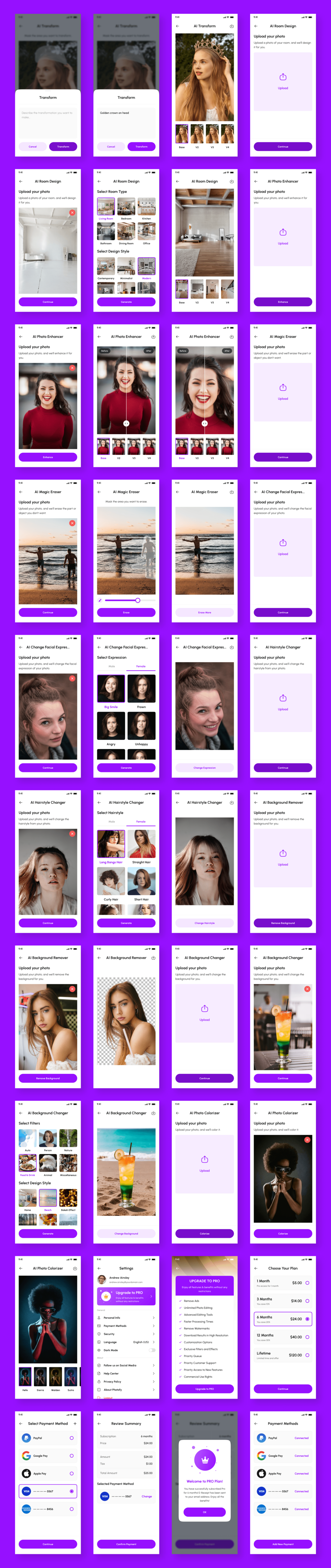 Photofy is a Premium & High Quality UI Kit with Full Functional of AI Photo Editor Mobile App. Photofy came with unique style and niche, you can easily edit and customize all elements with design components which can speed up design process for your projects. Everything is integrated with the design system, so you only need to change the color, logo, text, and so on in the design system, then the entire design screen will automatically change.