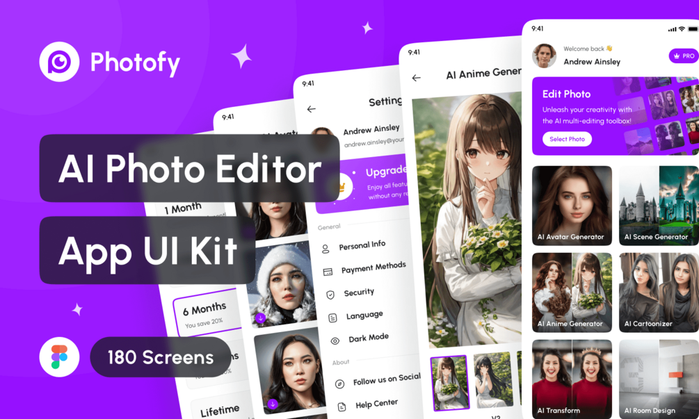 Photofy support for iOS/Android (design system included) and 180 screens which is 100% editable & customizable. Designs are available in Figma. In addition, the design is also equipped with a version of Light & Dark Theme.