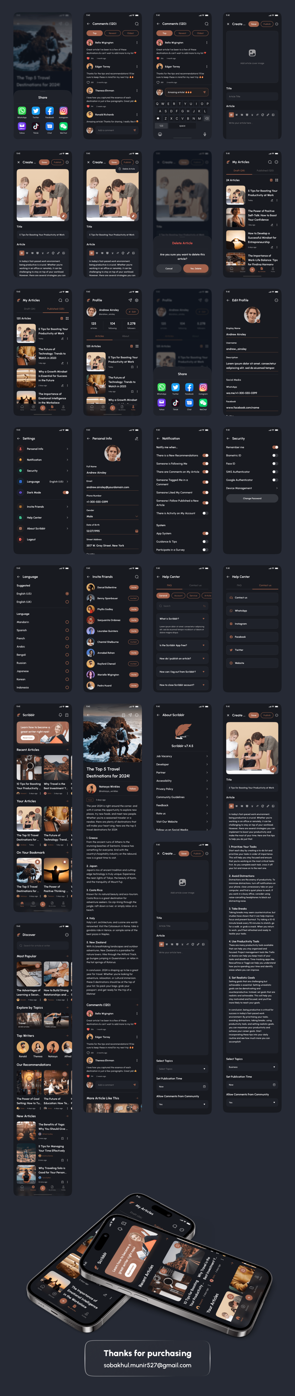 Scribblr support for iOS/Android (design system included) and 126 screens which is 100% editable & customizable. Designs are available in Figma. In addition, the design is also equipped with a version of Light & Dark Theme.