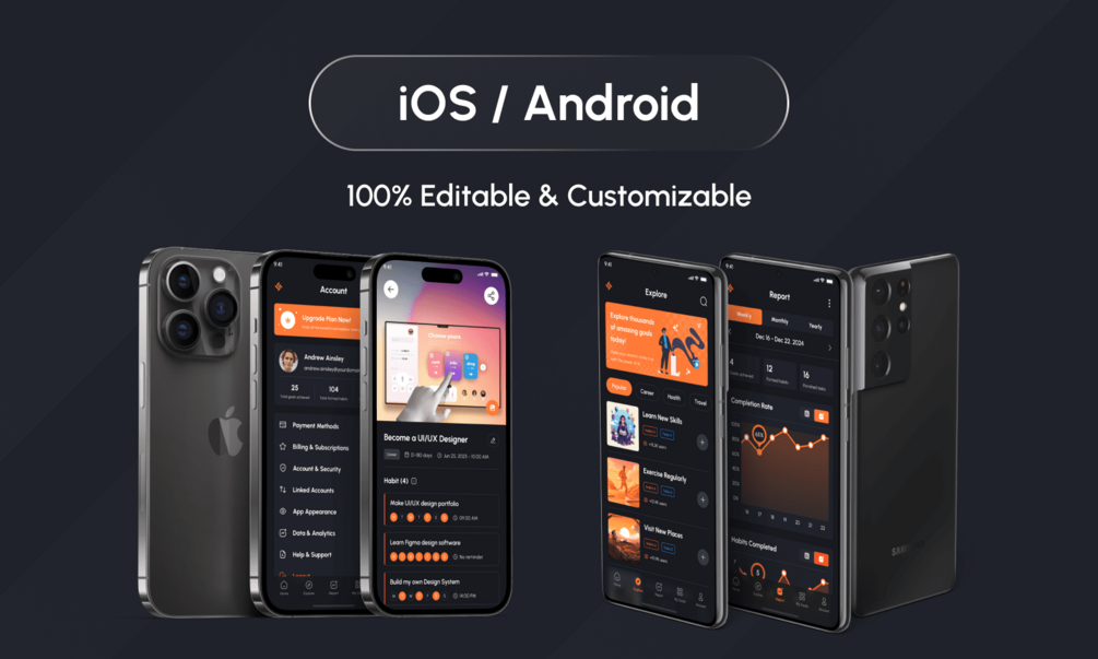 Taskify is designed in a modern and trendy style. You can easily edit and customize all elements with design components, which can speed up the design process for your projects. Taskify is suitable for iOS and Android and includes 165+ screens that are 100% editable and customizable.