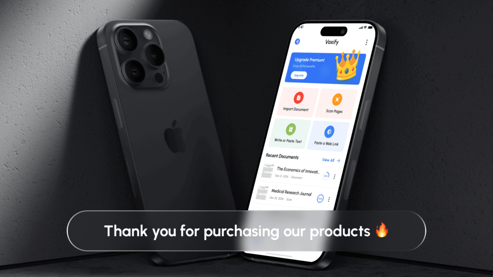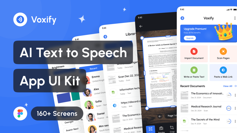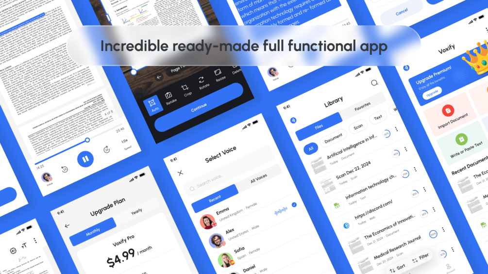 Voxify is a premium and high-quality UI Kit with a fully functional AI text to speech mobile app. Seamlessly convert text to speech from a variety of sources, including imported documents, scanned pages, written or pasted text, and web links. Choose from a range of voice options and conveniently manage all your documents in one place.