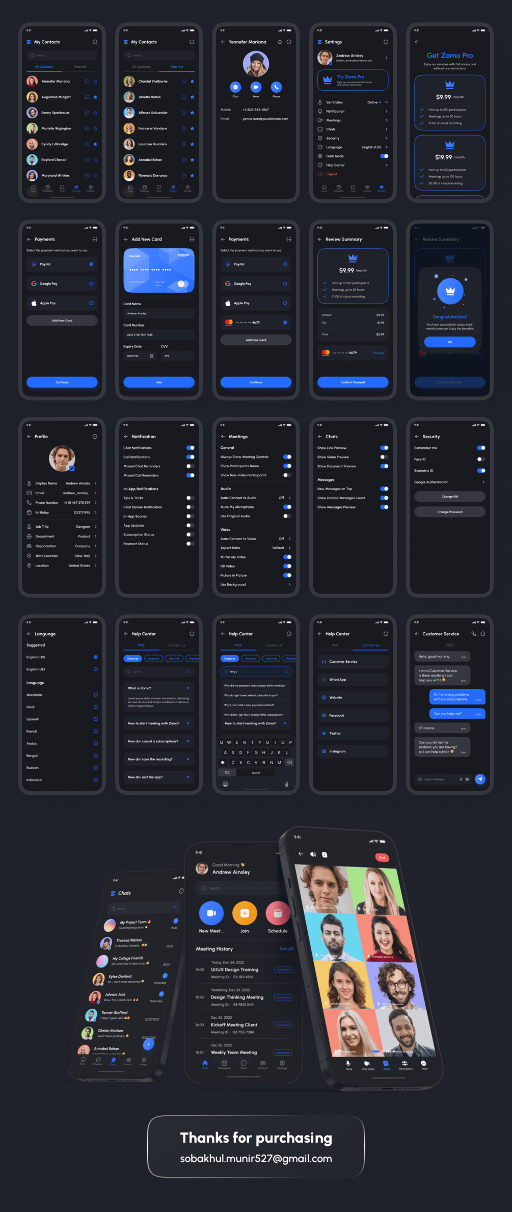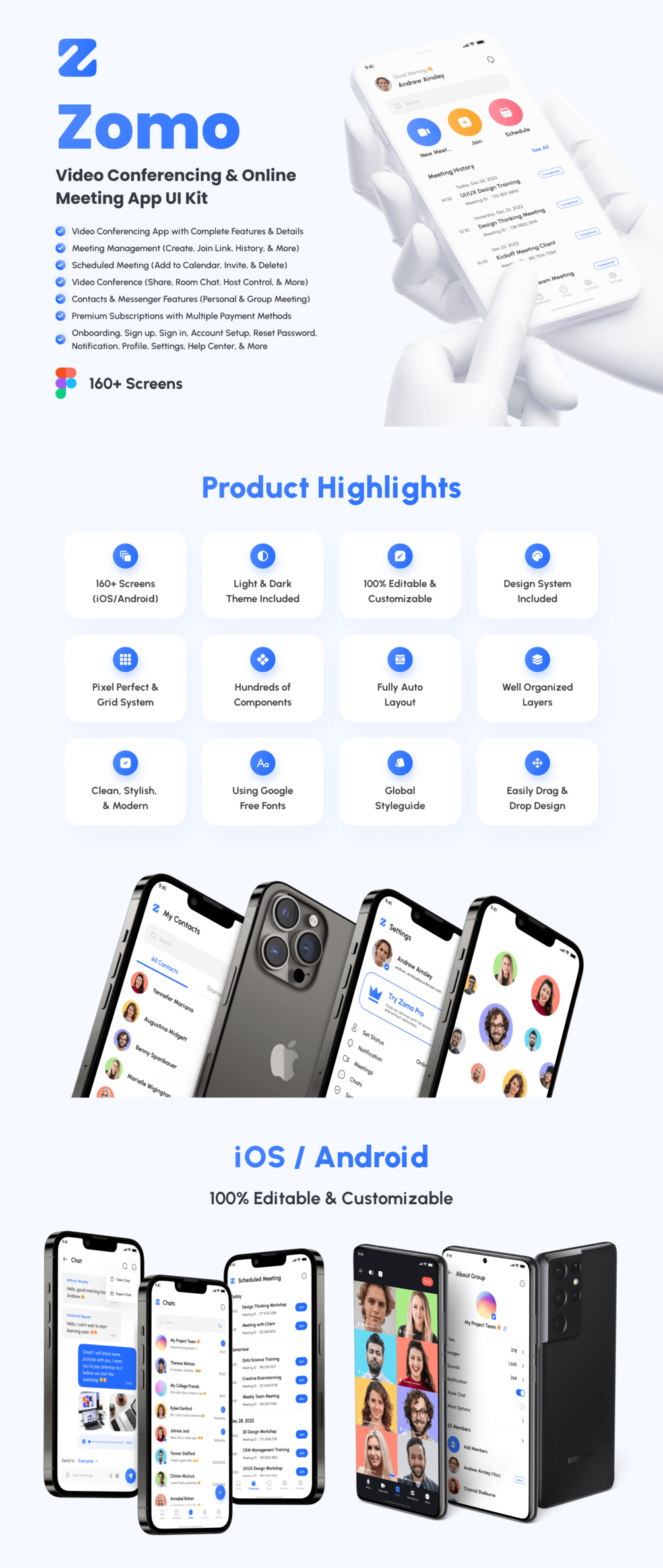 You'll get Zomo - Video Conferencing & Online Meeting App UI Kit Figma with 160+ screens + design system included. You will get it immediately after making a purchase. A download link will appear and you can download 100% editable UI Kit files without waiting time 🔥